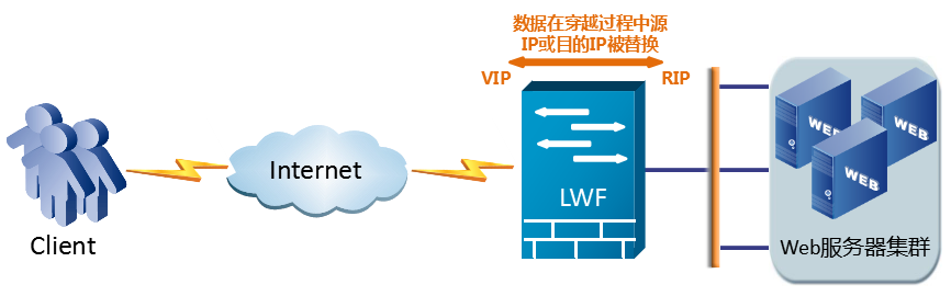 反向代理模式是一种应用层级的Web应用安全检测和防护模式,在部署环境中,Client访问的目的IP将变成LWF上的VIP,LWF再通过反向代理的方式来访问真实的Web Server。采用反向代理模式可以获得一些增值的功能,如路由、负载均衡等,但在部署时需要对现有网络环境进行配置改造。