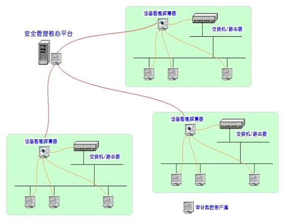 如上图所示,内网安全管理系统着重于内网的安全管理和监控,以系统网络运营管理为基础,以防内网泄密为目标,其核心功能由设备智能探测器、审计监控客户端、安全管理核心平台(包括内网管理、安全审计)协同完成。
